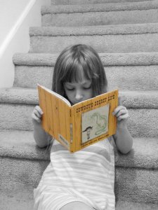 This afternoon we took a trip to the grocery store and before we made it to the bakery to get bread we were confronted by a bin of books on sale. K began to sift through them almost unconsciously asking if she could have one. I looked through the bin with her and peered at a few selections. I told her that she could choose a book and we could read it together.