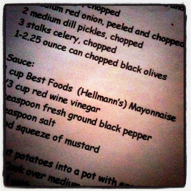 Last night I decided to make potato salad and so the big white binder was, of course, the place I went for instruction. I made some version of this same recipe back in January but I was missing stuff and just half assed the recipe. What I created was a new fork in this potato salad recipe. Last night I made my mom's version (which she changed from her mom's version). Well, close to my mom's version. I don't like raw red onions and I slightly bumped up the salt and we like more eggs and less celery. You get the point. Since summer is creeping its way on stage I thought I'd share it with all of you. It's my mom's outline with my changes.